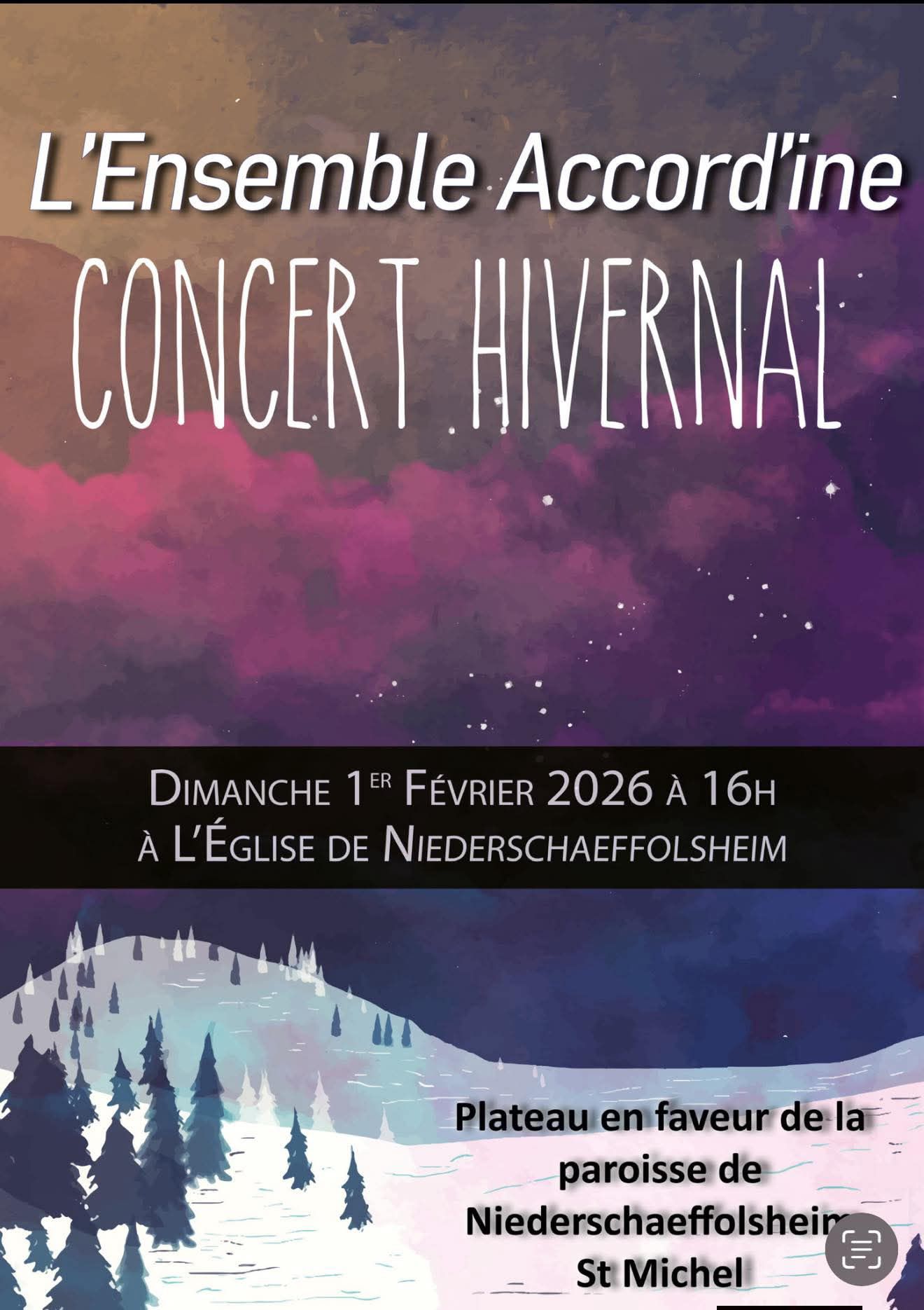 Concert Hivernal Posté le3 février 20263 février 2026 Superbe concert en l’Eglise de Niederschaeffolsheim en faveur de la Paroisse.C’est toujours un plaisir d’y jouer !